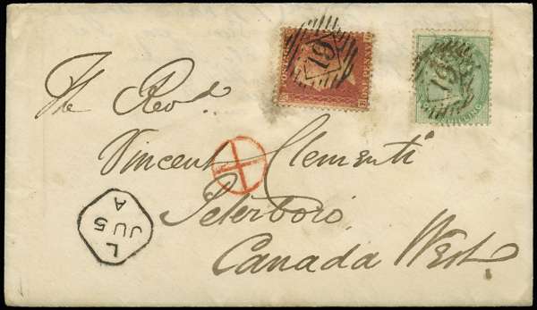 1858 Transatlantic mail. Very fine envelope sent from London to Peterboro, Canada double rate cover prepaid at 1s per 1oz by a 1s Green (SG 72) with an additional 1d Rose-red (SG 40) paying a 1d late fee both tied by London City "19" numerals with a Liverpool transit datestamp for JU.5.1858. Without sending endorsements and sent from Liverpool per Cunard steamer "Europa" to Halifax. Internally endorsed by the sender on the backflap "We have had a very cold spring all our children (7) have the hooping cough..." Most unusual.