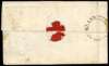 1840 1d Black Pl.5 (HA). Used entire from Bishop Aukland to Durham bearing four margin example tied by red MC, re-addressed to Wetherby. On arrival the stamps was crossed through in manuscript and endorsed “1” additional postage charge. A fascinating item full of character, original address erased possibly before re-addressing. Some light staining and minor peripheral faults. 2022 RPS Cert.