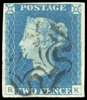1840 2d blue Plate 1 (RK) four close to large margins with inverted watermark, lightly struck by part black MC, a fine and most attractive example. SG 5wi £6000