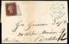 1845 entire letter from Moate to Dublin, bearing 1d red-brown Plate 51 (SA) showing crisp 331 numeral and Moate datestamp in vivid blue, backstamped by arrival for MY 31, most attractive and rare. SG 8; Spec. BS40xb, £650