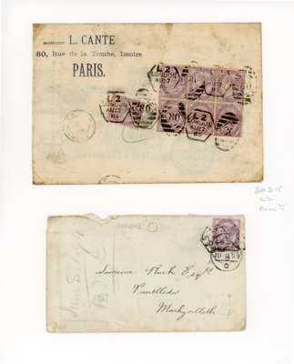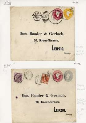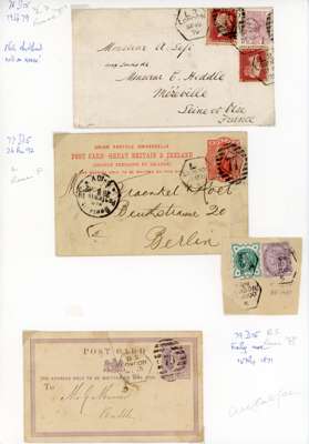1870-1900 small group of covers on album leaves of London late fee duplexes with hexagonal datestamp, Dubus Type 15 various codes, including mixed frankings, postal stationery and a block of six 1d lilac. 9 covers, 2 pieces