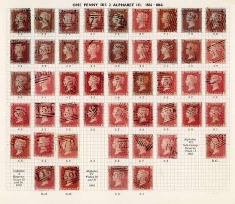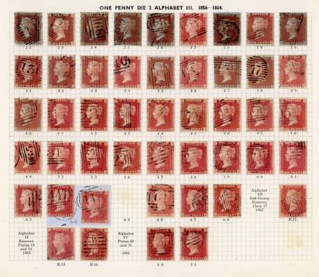 1856-64 1d reds twelve sheets, being the D row from the Wiggins plating book of Alphabet III, plates 22-68 plus R15-R17. 558 stamps out of a possible 576 are present, so missing 18. Included are 10 from 22, 7 from 64 and 1 from 65. All of these rarer plates are believed correct (they alone catalogue £11,650). Chiefly fine. Spec. C8-C13.