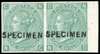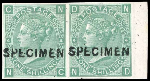 1867-80 watermark Spray of Rose 1s Plate 4, imperforate horizontal pair from the right of the sheet overprinted SPECIMEN (Type 6), unused with gum. Fresh appearance. Fine. SG 115/17, Spec J104s