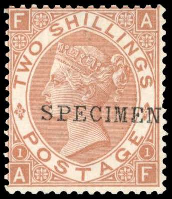 1880 2s brown Plate 1. Very fine and fresh o.g. example lettered AF, overprinted SPECIMEN type 9. Scarce. SG 121s