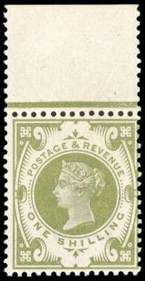 1899 1s Jubilee colour trial in olive-green, top marginal unmounted o.g,, small bend otherwise fine colour. SG 214 var