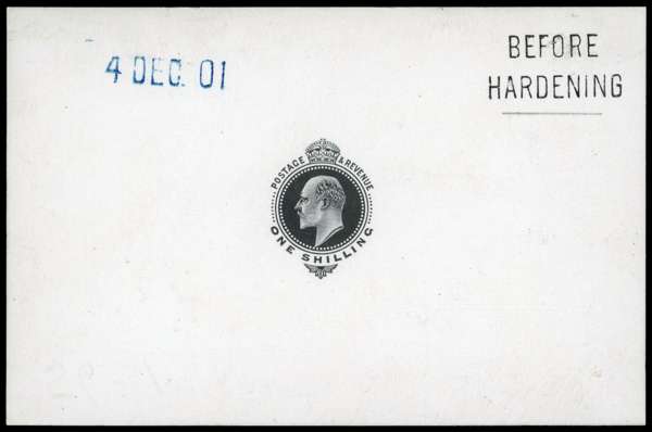1901 1s Die proof if Head Plate. Very fine example printed in black on white glazed card (92 x 60mm), endorsed BEFORE HARDENING and dated "4 DEC. 01". Very scarce. SG 257