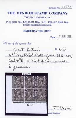 1912-24 Royal Cypher 4d deep bluish slate-green, mint control B.13 strip of three with lovely colour of this well-known shade only from Somerset House printings, fresh unmounted og. Rare and attractive. Hendon Stamp Company opinion (2021). Fine. SG Spec N22(4) var