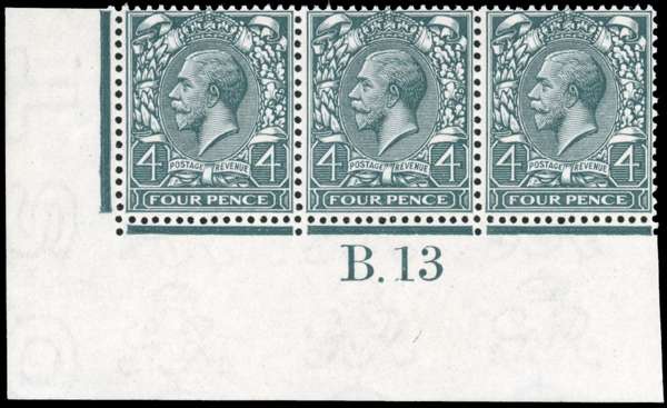 GB 1912-24 Royal Cypher 4d deep bluish slate-green, mint control B.13 strip