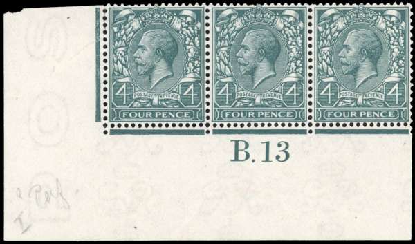 1912-24 Royal Cypher 4d bluish slate-green, fresh mint control B.13 strip of three with lovely colour of this well-known shade, only seen from the early Somerset House printings. Rare and attractive. Hendon Stamp Company opinion (2016). SG Spec N23(4) var