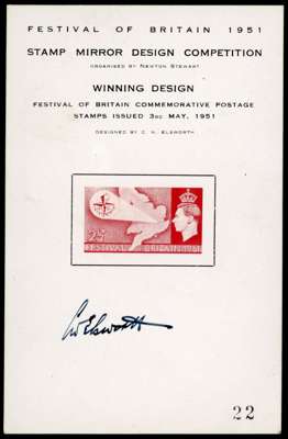 1951 Festival of Britain 2½d “Stamp Mirror Design Competition” essay in scarlet of an unaccepted design, signed below by the designer C.W. Elsworth and numbered ‘22’ below. Fine. SG 513 var