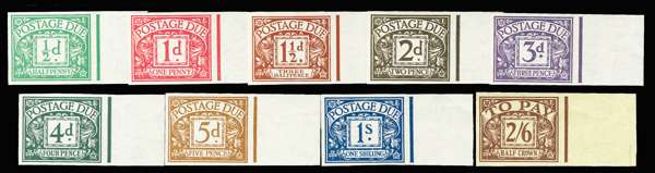 1924-31 ½d-2s6d Postage Dues (Waterlow printing). Very fine unmounted o.g. set of nine right marginal imperforate imprimaturs, each with a BPMA handstamp on reverse. Scarce. SG D10-18