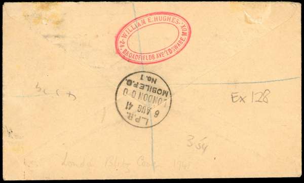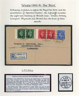 1941 registered envelope bearing ½ and 1d booklet panes of two, plus 2½d light ultramarine, addressed to Douglas B. Armstrong, cancelled by three strikes of “L.P.R./ 6 AUG 41/ LONDON C O/ MOBILE P.O./ NO. 1”, On album page with copy of GPO Notice.