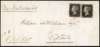 1840 1d black, two singles from plate 1b lettered ‘EE’ and ‘EF’, both good even margins, on cover to Wigton neatly tied by scarlet Maltese Cross of Stranraer, backstamped by red cds (9.10). Attractive. SG 2