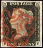 1840 1d black Plate 2 (BF) four good to large margins, with small trace of adjoining stamp at right, used well struck by crisp red MC, fine. SG 2 cat £375