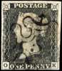 1840 1d Black Pl.6 (OK), with four close to very large margins, neatly cancelled by a crisp strike of the London No. 5 in MC. An extremely rare cancellation on this issue. RPS Cert (1973), Spec. AS41we cat £12,000.