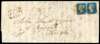 1840 2d blue, Plate 1, horizontal pair (PI-PJ), PI with recut SW corner square, good to very large margins, on cover to Meigle, both stamps tied by a orange-red Maltese cross, two Forfar boxed handstamps at left for FE 19 1841; slight aging affecting the adhesives, otherwise fine and scarce. RPS Certificate (1995). SG Spec DS5gua
