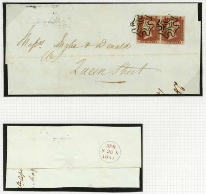 1841 1d red-brown, Plate 2, horizontal pair (EE-EF), good to large margins, on cover sent within Edinburgh, neatly tied by two superb strikes of the distinctive branch office black Maltese Cross showing consistent large and small dots within the outer and inner arms, backstamped by cds for APR 26 1841; horizontal filing fold clear of the adhesives. Fine and rare use of the distinctive Edinburgh cross. SG 7