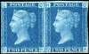 1869 2d blue with thin white lines on Dr Perkins blued paper, Pl. 13 (QG-QH), horizontal pair mint large part o.g. ‘QH’ just shaved at right. Lovely colour and fine gum. SG 46; Spec G3(2)f cat £14,000+