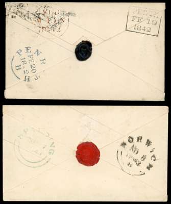 Postal Stationery. 1842 (19 Feb) 1d pink envelope to Penrith bearing fine strike of the distinctive Perth Maltese Cross, backstamped with despatch, Edinburgh transit (19.2) and Penrith arrival (20.2) datestamps and (6 Nov) 1d pink envelope to Spalding cancelled by distinctive Norwich Maltese Cross (type 2), backstamped with despatch and Spalding arrival (7.11) datestamps. Fair to fine. (2)
