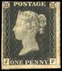 1840 1d black, Pl. 2 (JF), with constant variety, mint, unmounted o.g. with three good to large margins, just touching at top and showing traces of adjacent stamps at right and foot. Some gum toning showing through to the front, still a very desirable example. Brandon cert (1978), Spec. AS14k, SG 2var, £13,000.