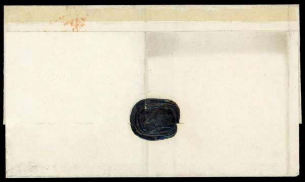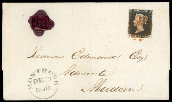 1840 1d grey-black, Pl. 3 (TI), with four close to good margins, on wrapper from Montrose to Aberdeen, tied by red MC, with Montrose cds at lower left for DE 29 and bearing a “Post Office Montrose/JB” wax seal above. Tiny defect to the lower right corner of the adhesive and central filing fold, still a fresh looking and unusual cover. SG 3.