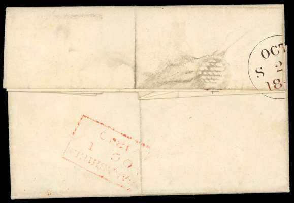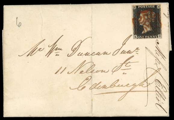 1840 1d black, Pl. 6 (KD), with four close to good margins, on entire to Edinburgh, cancelled by orange-red MC and backstamped with Galashiels despatch boxed h/s for 1 OC and part cds for the following day. Vertical filing fold clear of the adhesive, otherwise fine. SG 2.