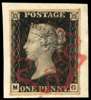 1840 1d black, plate 6 (MG), used tied to small piece with neat ruby Maltese cross. Fine. SG 2 var, Spec A1ve