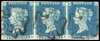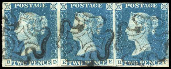 1840 2d blue Plate 1 (RD-RF) horizontal strip of three, touching to good margins, used bearing three individual strikes from black MC, small scissor cut to ‘F’ tablet, otherwise fine. SG 5 cat £2900+
