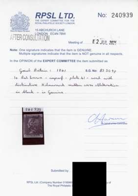 1841 1d red-brown, plate 41 (PA), close to large margins, cancelled by distinctive Kilmarnock black Maltese Cross just clear of the Queen's profile; vertical crease not detracting from attractive appearance. RPS Certificate (2025). SG 8l var, Spec BS30tp