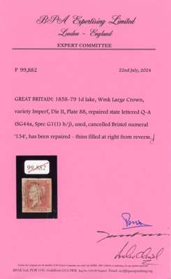 1864-79 1d lake-red, Plate 88 (QA, repaired state), variety imperforate with four good to large margins, used by Bristol ‘134’ barred numeral cancellation, some filled thins on reverse, still a very collectable example of this scarce variety. Pink BPA Certificate (2024), Spec. G1(2)h,j, SG 44a, £2,500.