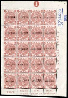 1867-80 10d pale red-brown, plate 1, wmk Spray of Rose, complete upper right pane of 20 (4x5) with full margins showing sheet inscriptions and plate number, each opt ‘SPECIMEN’ (type 9), fresh mint o.g., highly attractive and very desirable with plate number. SG 113 var, cat £10000+