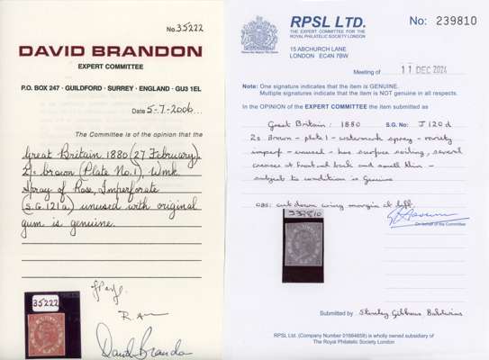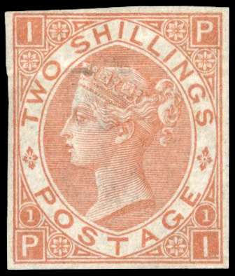 1867-80 2s brown, Plate 1 (PI), imperforate example mint, large part o.g., some creasing and a small thin, still a collectable example of this great rarity. Brandon (2006) and RPS (2024) Certificates, the latter states ‘surface soiling’ which we believe to be harsh. SG 121a, £20,000.