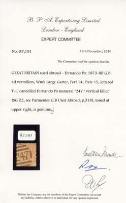 GB used abroad: Fernando Poo. 1874-77 4d vermilion Plate 15 (TL), used by a fine strike of the ‘247’ barred numeral cancellation. Some toning and unobtrusive handstamp on reverse, still a very presentable example. BPA Certificate (2016), SG Z2, £2,000.