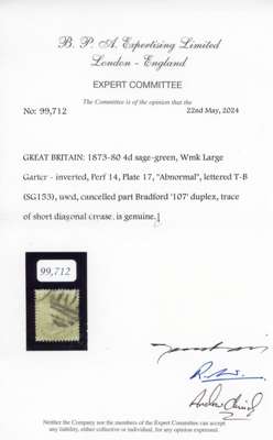 1873-80 4d sage-green Plate 17 (TB), watermark inverted, ‘Abnormal’ cancelled with part Bradford ‘107’ duplex at top leaving left plate number clearly visible. Facially fine, with some light creasing, of little importance as only around 28-30 examples are recorded, of which half have the watermark inverted. BPA Certificate (2024), SG 153, £20,000.