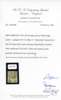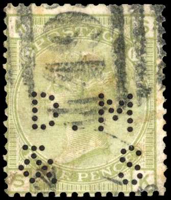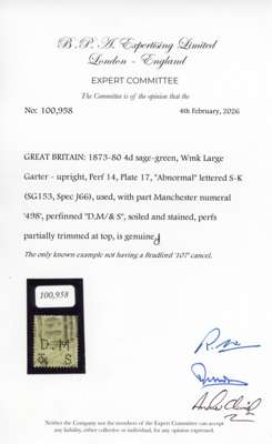 1873-80 watekrmar Large Garter 4d sage-green plate 17 (SK), ‘ABNORMAL’ cancelled with part ‘498’ numeral of Manchester; perfinned ‘D.M/& S', soiled and stained, perfs partially trimmed at top. A collectable example of this rare abnormal of which now 25 examples are known to exist. BPA Certificate (2026). SG153, Spec J66