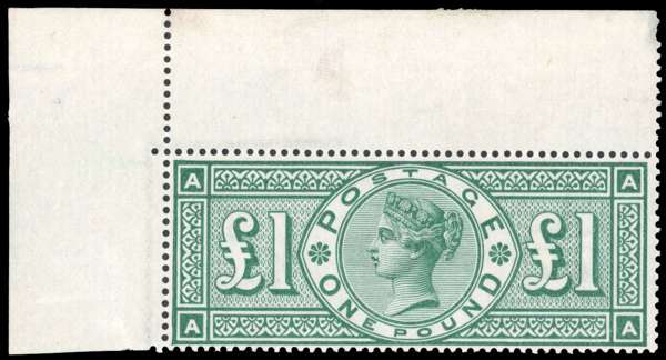 1891 £1 green (AA) in top left corner marginal, some heavy hinging in top margin, the stamp fine unmounted o.g.