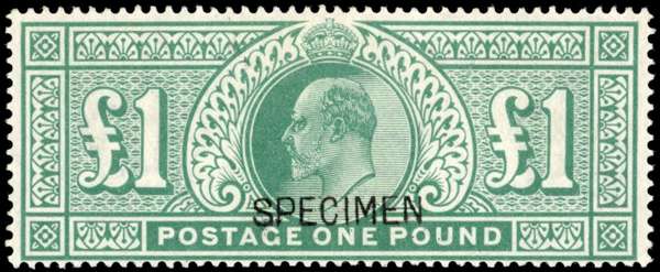 1902-10 £1 dull blue-green, overprinted SPECIMEN type 16, mint large part o.g.; minor ink offsets on gum, otherwise fine. SG 266s cat £1400