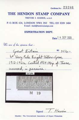 1912–24 Royal Cypher ½d very pale bright yellow green mint control M19 horizontal pair, large part o.g., right stamp with gum crease. Fair with a lovely pale pastel colour. Hendon Stamp Company opinion (2020) (for a strip of three). SG354 var, Spec N14 (11) var