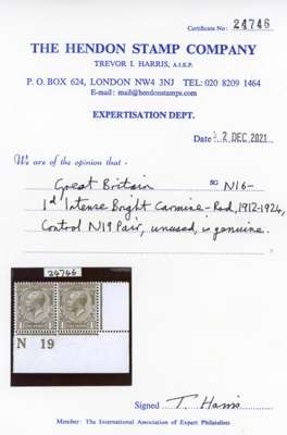 1912–24 Royal Cypher 1d intense bright carmine-red, mint lower right corner example, large part o.g. with gorgeous deep colour. Hendon Stamp Company opinion (2021) (for a control pair). SG 360 var, N16 (12) var