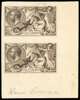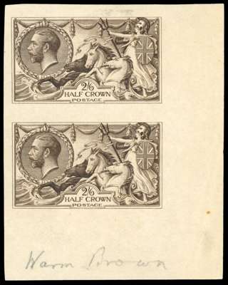 1913 2s6d ‘Seahorse’ colour trial in brown, imperforate lower right corner vertical pair on ungummed Wrigley paper, pencil endorsement at foot “Warm Brown”, minor bends and trivial thinning in upper margin but extremely rare in this colour. SG 399 var
