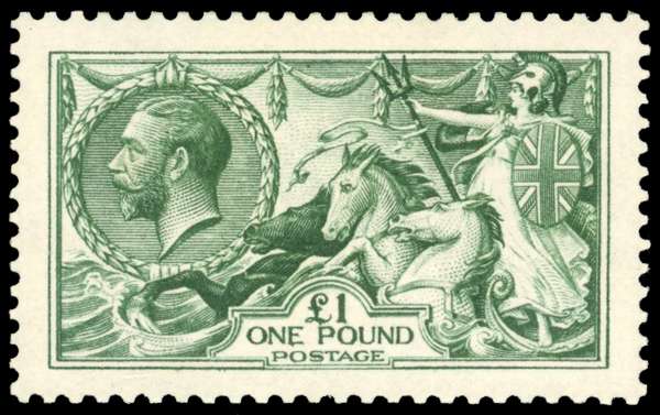 1913 £1 green large part o.g., lightly hinged and well centred, slight gum wrinkle at right side mentioned for accuracy; a very fine looking example