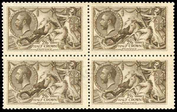 1915 2s6d sepia (seal-brown), DLR printing with watermark inverted, block of 4 with the lower pair showing ‘POS’ of ‘POSTAGE’, mint o.g., the lower left stamp with a couple of minor gum wrinkles otherwise fine and very scarce. SG 408wi, cat £5000