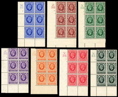 1934-36 Photogravure set ½d to 1s in corner marginal cylinder blocks of six