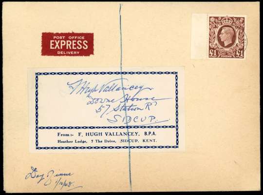 1948 £1 brown on express cover used on the first day ‘1 OC 48’. Fine. SG 478c