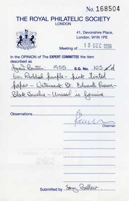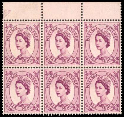 1955 St Edward's Crown, 6d reddish purple, upper marginal block of six variety ‘PINK TINTED PAPER’, Fine. RPS Certificate (1996). SG 548 var, Spec S105d