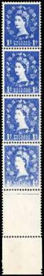 1959 Multiple Crowns 1d ultramarine, cream paper, mint unmounted lower marginal strip of five with stunning dry print, the lower stamp with virtually complete colour omitted. Fine. A most unusual item. SG 571 var, S16 var
