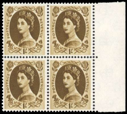 GB: 1958 Multiple Crowns, cream paper, 1s bistre-brown, mint right marginal block of four variety ‘DOUBLE IMPRESSION’, fine