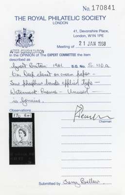 1961 Multiple Crowns, cream paper, 6d deep claret, two phosphor bands reacting blue, mint unmounted with bands applied by letterpress (typograph). Fine. RPS Certificate (1998). SG 617 var, Spec S110a