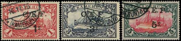 Cameroons Expeditionary Force: 1915 1s on 1m to 5s on 5m surcharges, set of three, lightly cancelled. Fine. SG B11-B13; Mi 11-13