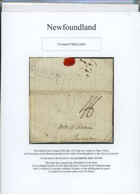 1830s-1930s postal history collection, comprising of mostly incoming mail from England, well researched and mounted on exhibition pages, including: 1837 pre-stamp entire letter from Newfoundland to Leicester, rated at 1/6 and marked Liverpool Ship Letter boxed h/s, 1851 pre-stamp cover from Quebec with paid 3d h/s, incoming covers from England, franked by Line Engraved and surface printed issues, showing the various rates, with mourning cover from Glasgow, 1884 registered envelope franked by 1884 2½d, 1871 1d pink postal stationery envelope uprated by 1d rose-red pair, marked insufficiently stamped, underpaying the rate of 6d by 3d! 1862 cover franked by 2d blue (3) endorsed via ‘Trinity’, generally fair to fine condition and interesting lot.